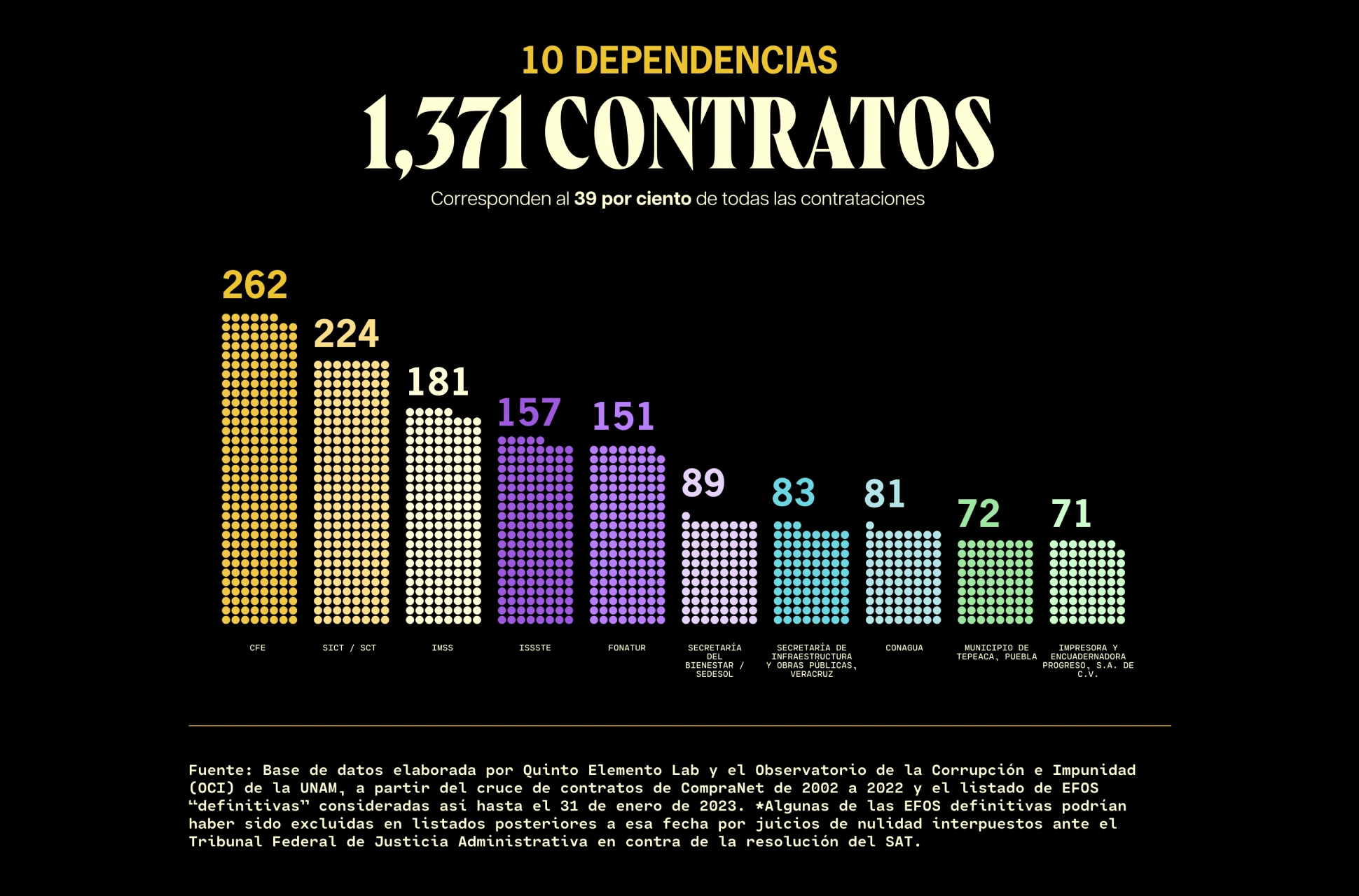 Quinto Elemento Lab, en colaboración con el Observatorio de la Corrupción e Impunidad (OCI) del Instituto de Investigaciones Jurídicas de la Universidad Nacional Autónoma de México (UNAM), realizó este análisis a partir de una base de datos en la que se cruzaron los contratos federales disponibles en CompraNet (2002–2022) con el listado más actualizado del SAT de EFOS definitivas al 31 de enero de 2023. Dado que este registro se actualiza periódicamente, algunas empresas consideradas como definitivas al momento del análisis podrían haber sido excluidas en versiones posteriores.