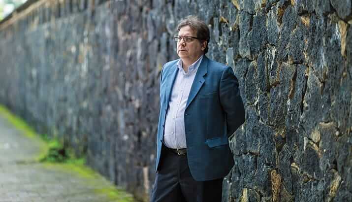 Este hombre alto con el cabello cano de 48 años de edad, viste camisa azul, corbata y lentes de pasta que le dan ese aire intelectual. Ha puesto su iPhone sobre la mesa y juega con una pluma fuente en la mano de manera desinteresada.