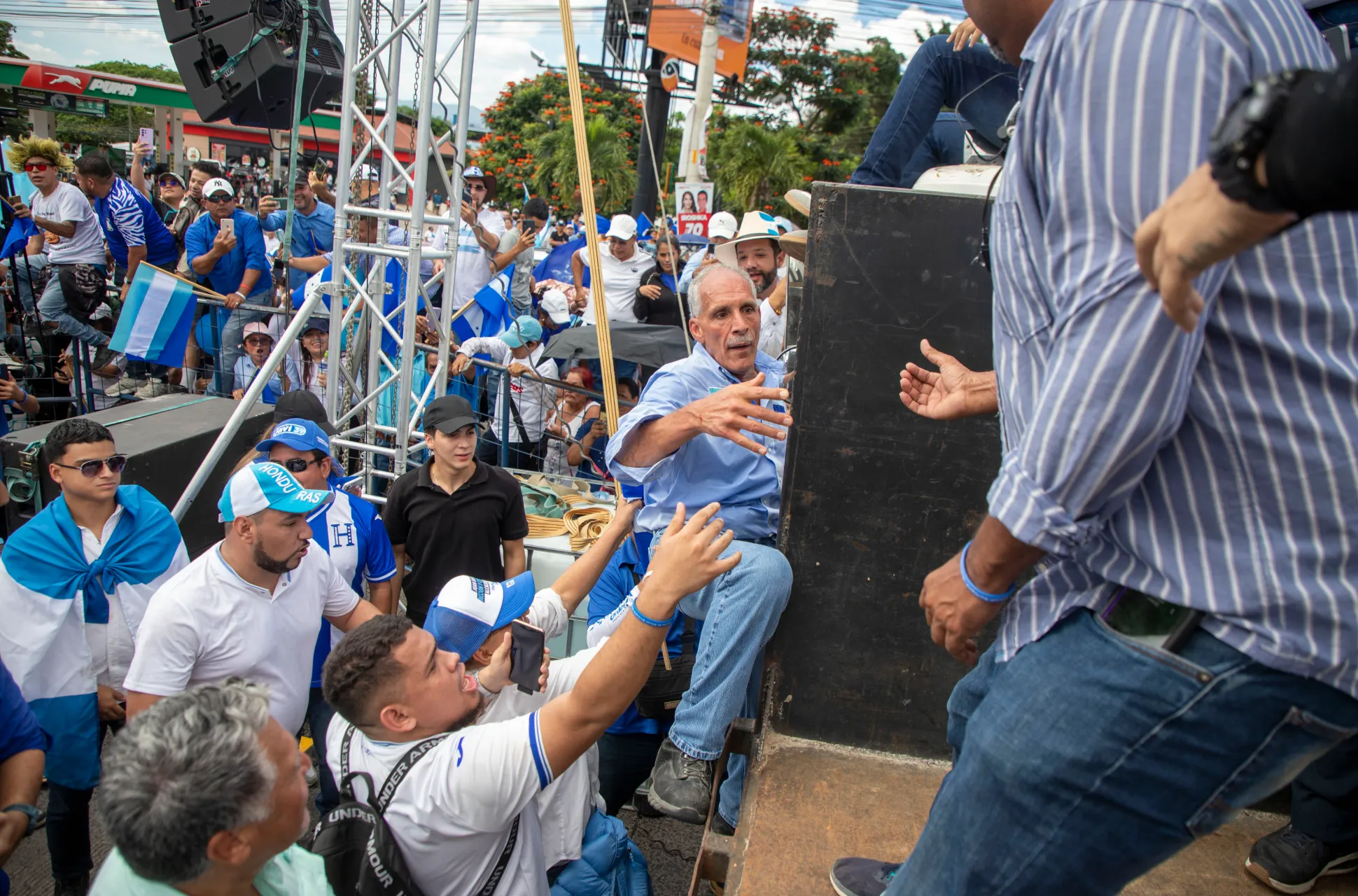 La noche comenzó con una mezcla de reguetón y cánticos cristianos, anunciando a un pastor que llegó a bendecir las candidaturas de Asfura y su candidato a alcalde de la capital, Juan Diego Zelaya. Asfura es un hombre de 68 años, pero cuando aparece en el escenario salta, grita con la energía de un jovencito y le clava tres besos en la boca a su esposa, porque Asfura no solo es el candidato bendecido por Trump, sino también el protector de la familia tradicional, de la Iglesia, de “los valores cristianos”.