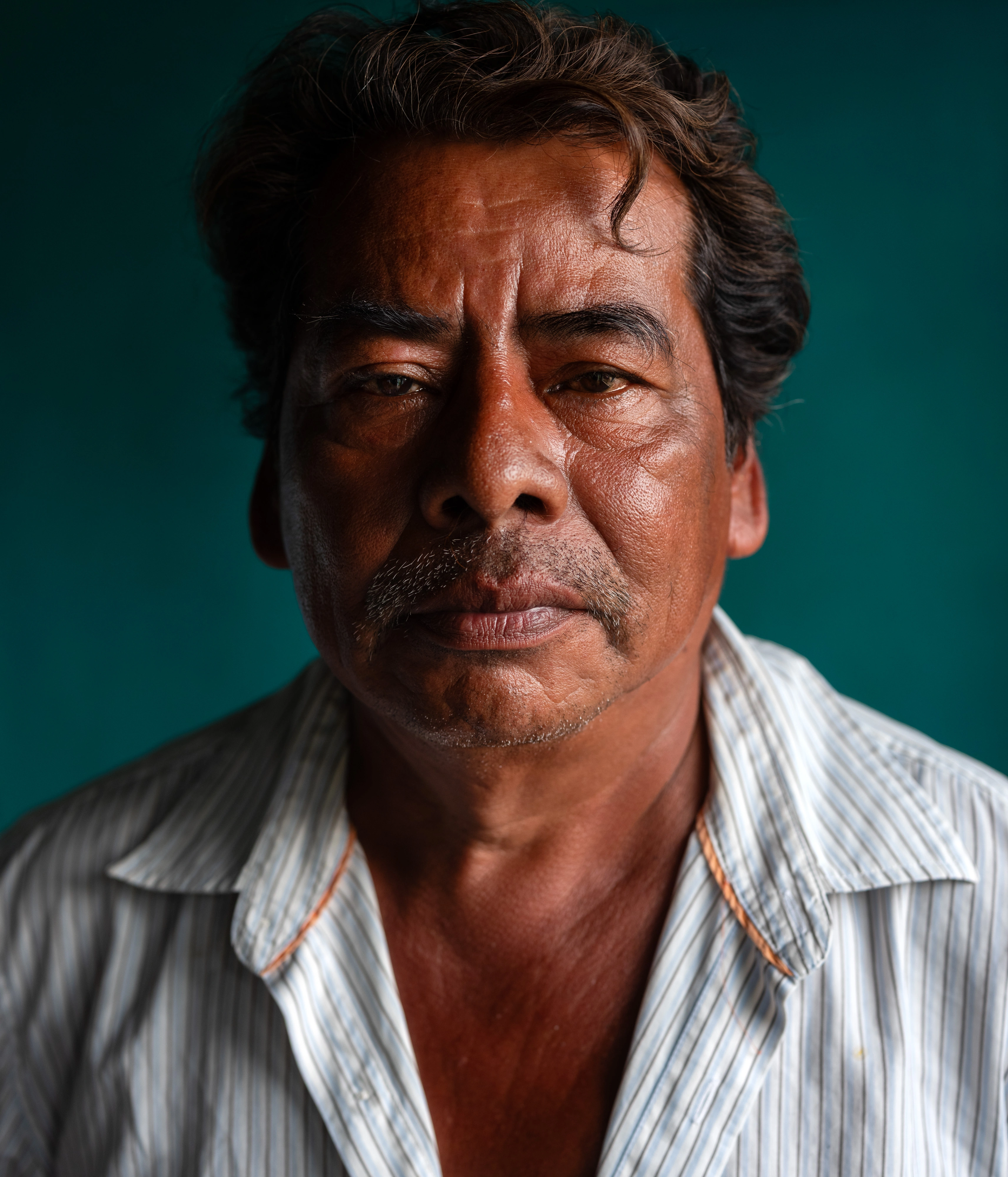El tata Romualdo García de Luna es un artista de la madera. Su padre, un carpintero —y volador de Papantla—, le enseñó el oficio. El tata Romualdo sueña deidades totonacas que luego transforma en máscaras. Da talleres todo el año, también durante la Cumbre Tajín, evento estrella de estas tierras. Allí lo conocimos, y días después nos guió por diferentes comunidades. La suya, Ojital Viejo, en 2024 sufrió un derrame que se extendió por seis kilómetros a través de un arroyo y luego por el río Cazones, que desemboca en el mar.