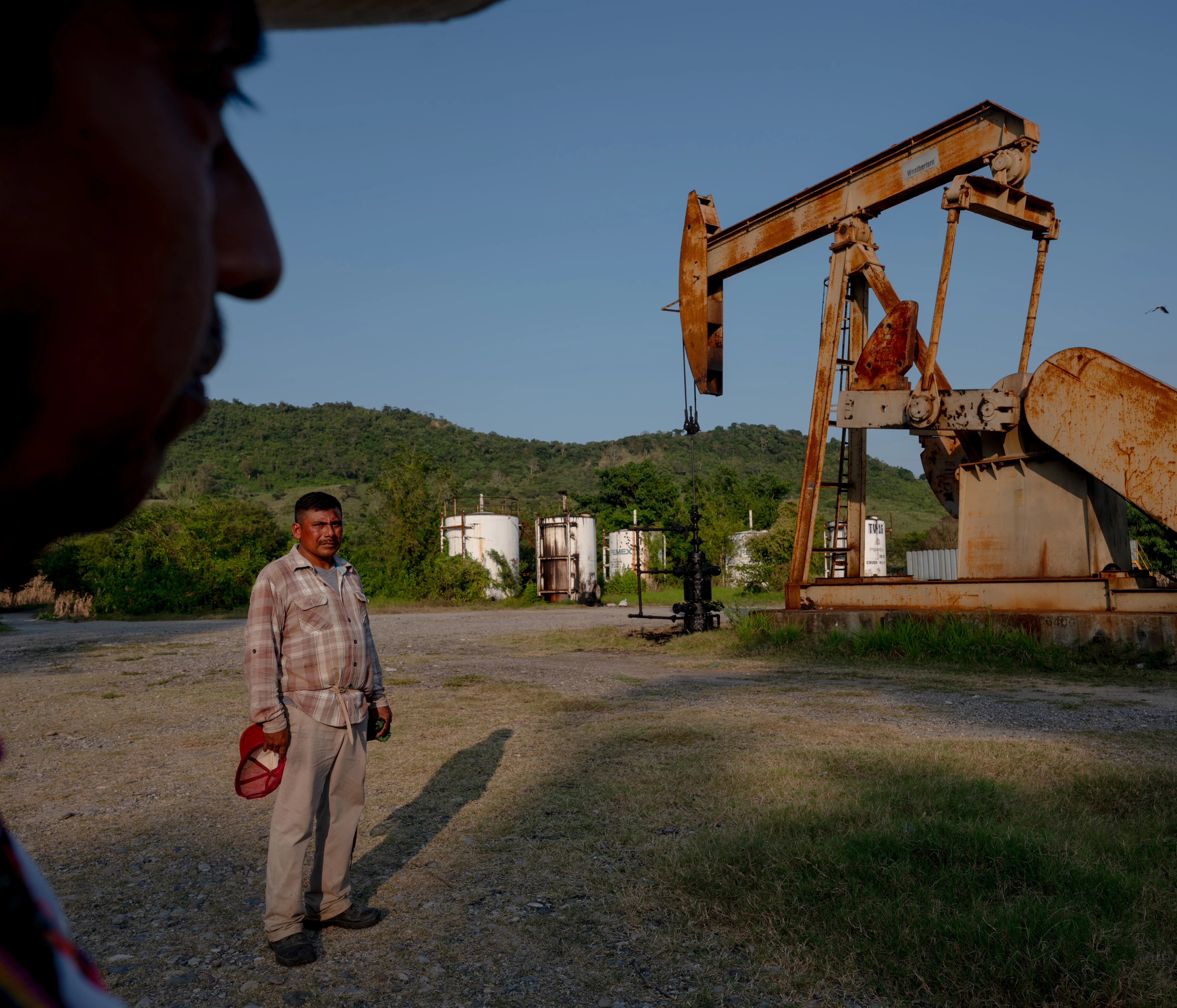 Pedro García García vive en la primera casa del pueblo. Delante de su vivienda, tres grandes cruces. Es agente municipal, 47 años, una personalidad alegre y conversadora. Usa una gorra de Morena cuya inscripción dice Vote por Rocío Nahle. Nos muestra con orgullo la bomba de agua que lograron instalar con el esfuerzo de toda la comunidad. Alrededor todo es milpa. Nos da de probar mandarinas, y saca unas hojas de un naranjo y un limonero para que las olamos. Árboles por todos lados. Guanabana, cayote, zapote. Pero de pronto llega el olor. Cruzando un pequeño curso de agua, detrás de la milpa, una bomba de varilla oxidada sube y baja. Cinco tanques de Pemex manchados, un par de contenedores abandonados y crudo derramado de años. La escalera de un contenedor está completamente carcomida: pareciera que un dinosaurio hubiera mordido los escalones. El olor es el más fuerte que hemos sentido en ocho años de recorridos por zonas petroleras. Se ve gas saliendo de un tubo en lo alto de uno de los tanques. Nos empieza a doler la cabeza —ese compañero de trayecto— y tenemos que irnos.