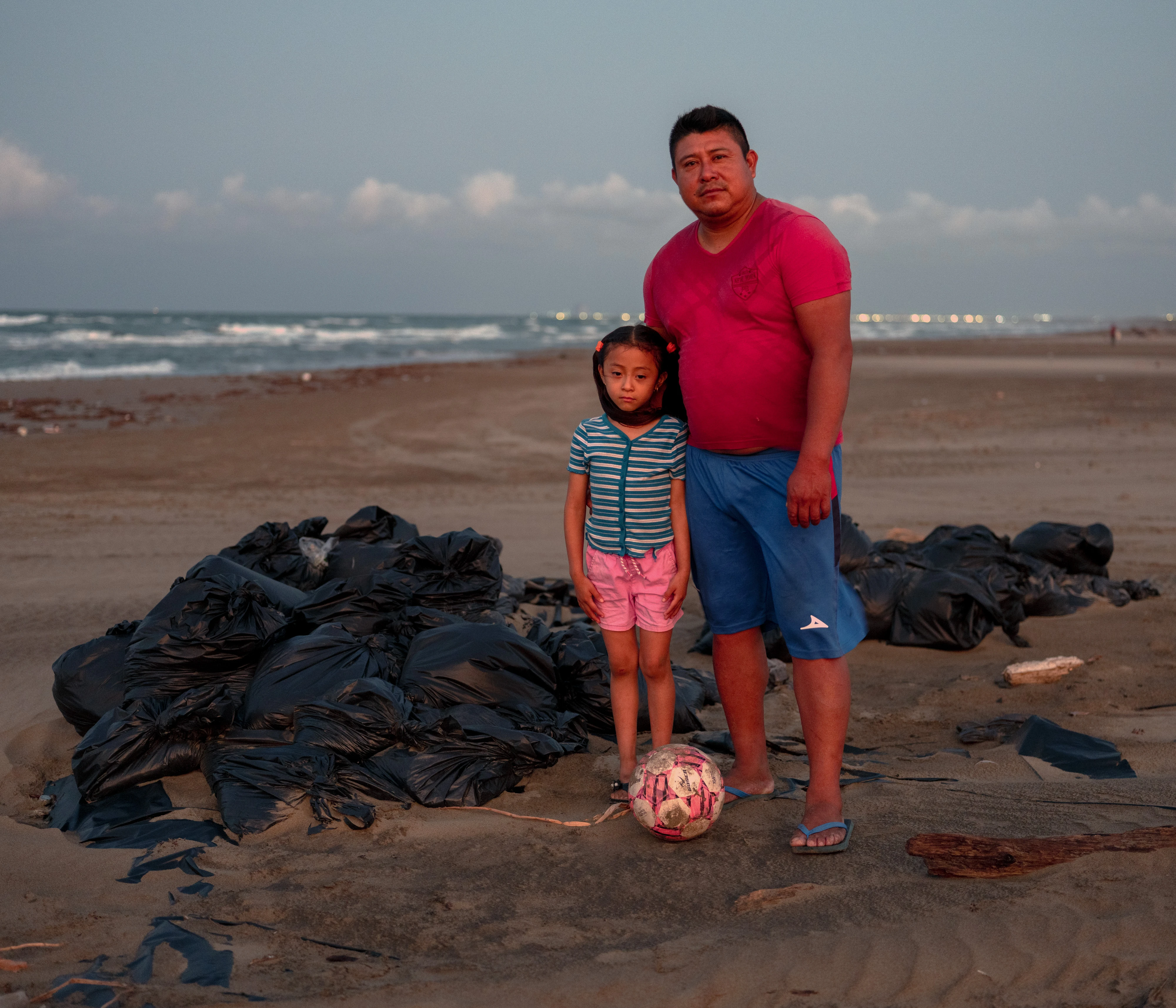 Camino hasta el mar. El sol es una línea, ya casi no hay luz para las fotos. Las olas rompen, blancas, a orillas de la inmensidad de la noche. A lo lejos, un hombre patea una pelota con su hija. El viento, aún tenue, empieza lentamente a cubrir de arena los montículos de bolsas de chapopote.