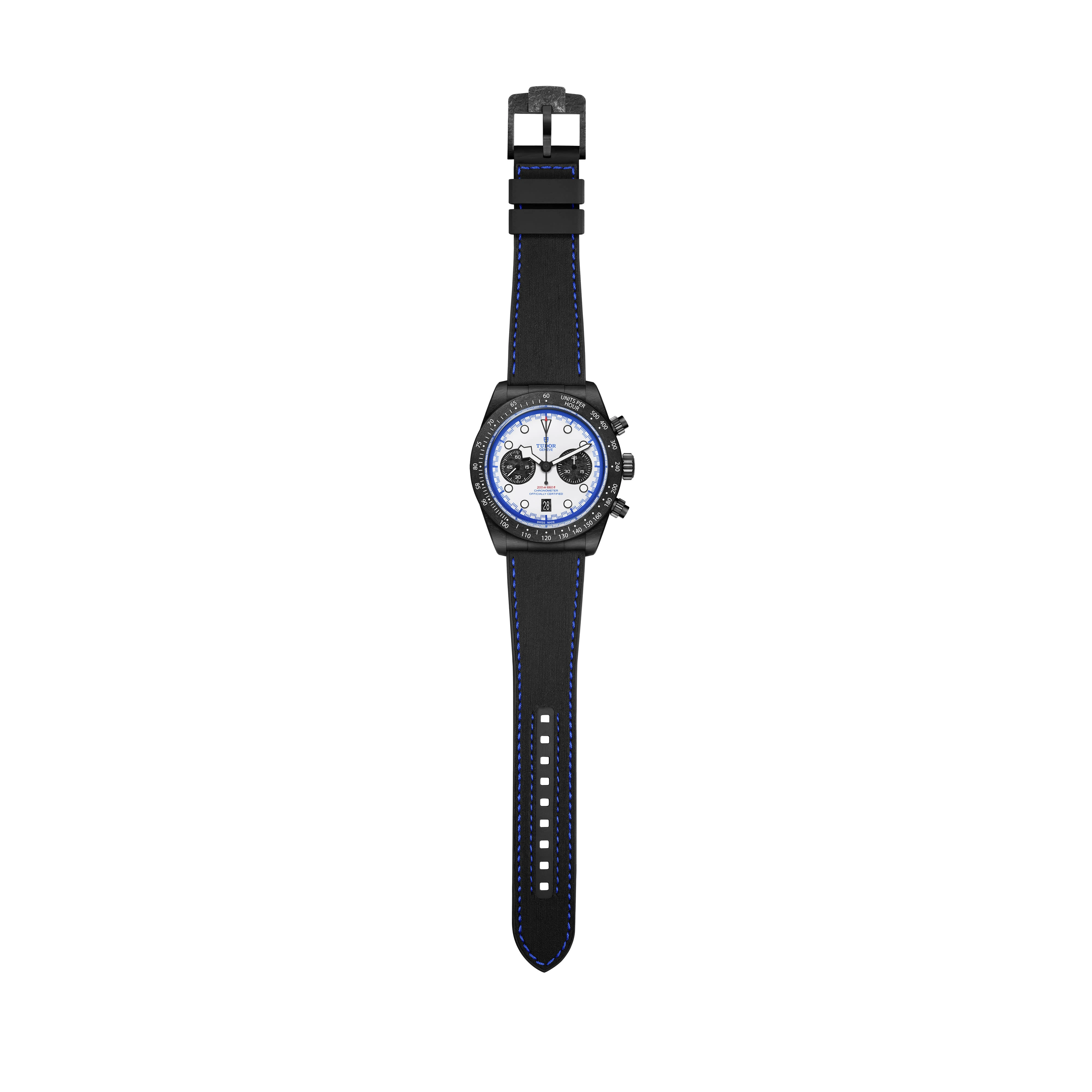 El nuevo reloj cuenta con los códigos estéticos del auto que Racing Bulls diseñó para la competición de este año: la esfera se presenta en blanco mate con un anillo exterior azul y acentos en rojo. Solo se hicieron 2 025 ejemplares del Black Bay Chronograph “Carbon 25”, en un homenaje a este importante año en la historia en constante evolución del automovilismo de TUDOR. En el fondo de titanio con acabado PVD se identifica el número individual del reloj.